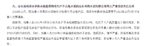 山東省菏澤市單縣市場(chǎng)監(jiān)管局將生產(chǎn)不合格水泥的山東中固水泥有限公司列入嚴(yán)重違法失信名單 。2021年11月,因當(dāng)事人銷售的水泥被多次檢測(cè)為不合格產(chǎn)品,菏澤市單縣市場(chǎng)監(jiān)管局于2021年12月3日對(duì)當(dāng)事人立案調(diào)查。