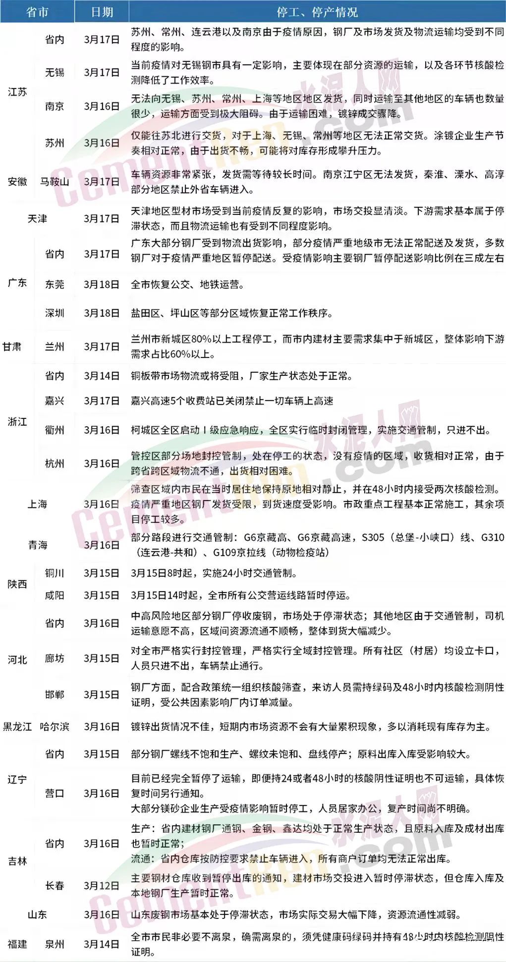 3 廣東省大部分鋼廠受到物流出貨影響,部分疫情嚴(yán)重地級市無法正常配送及發(fā)貨,多數(shù)鋼廠對于疫情嚴(yán)重地區(qū)暫停配送。受疫情影響主要鋼廠暫停配送影響比例在三成左右;東莞全市恢復(fù)公交、地鐵運營;深圳鹽田區(qū)、坪山區(qū)等部分區(qū)域恢復(fù)正常工作秩序。