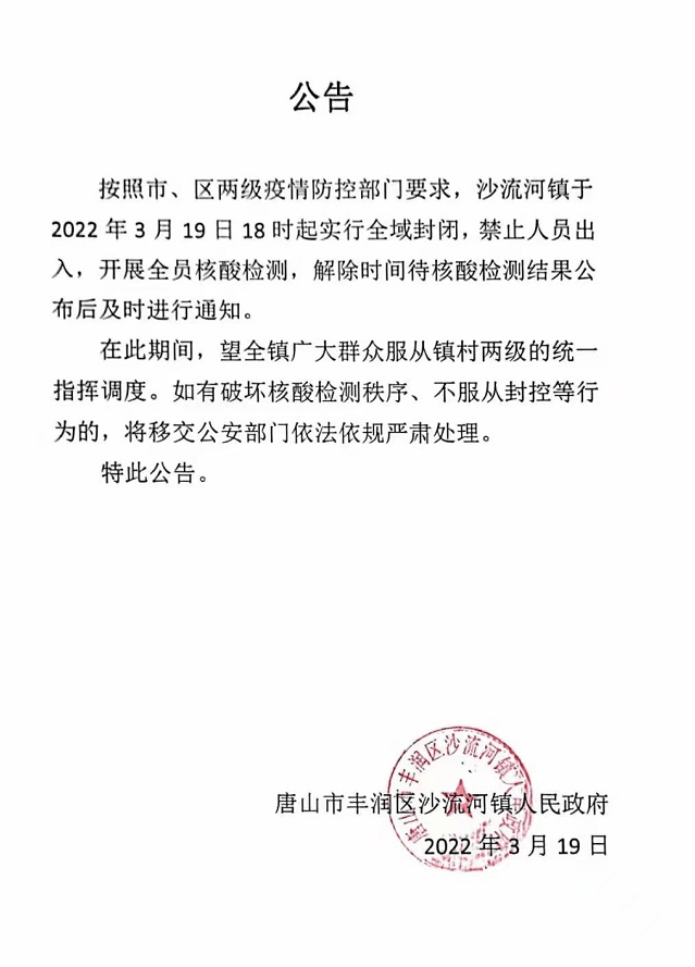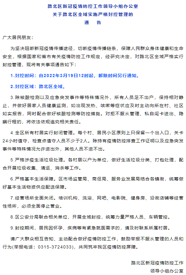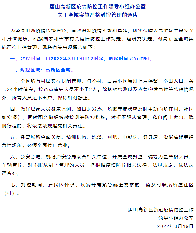 水泥重鎮(zhèn)唐山市多個區(qū)縣通知全域?qū)嵤﹪?yán)格封控管理。