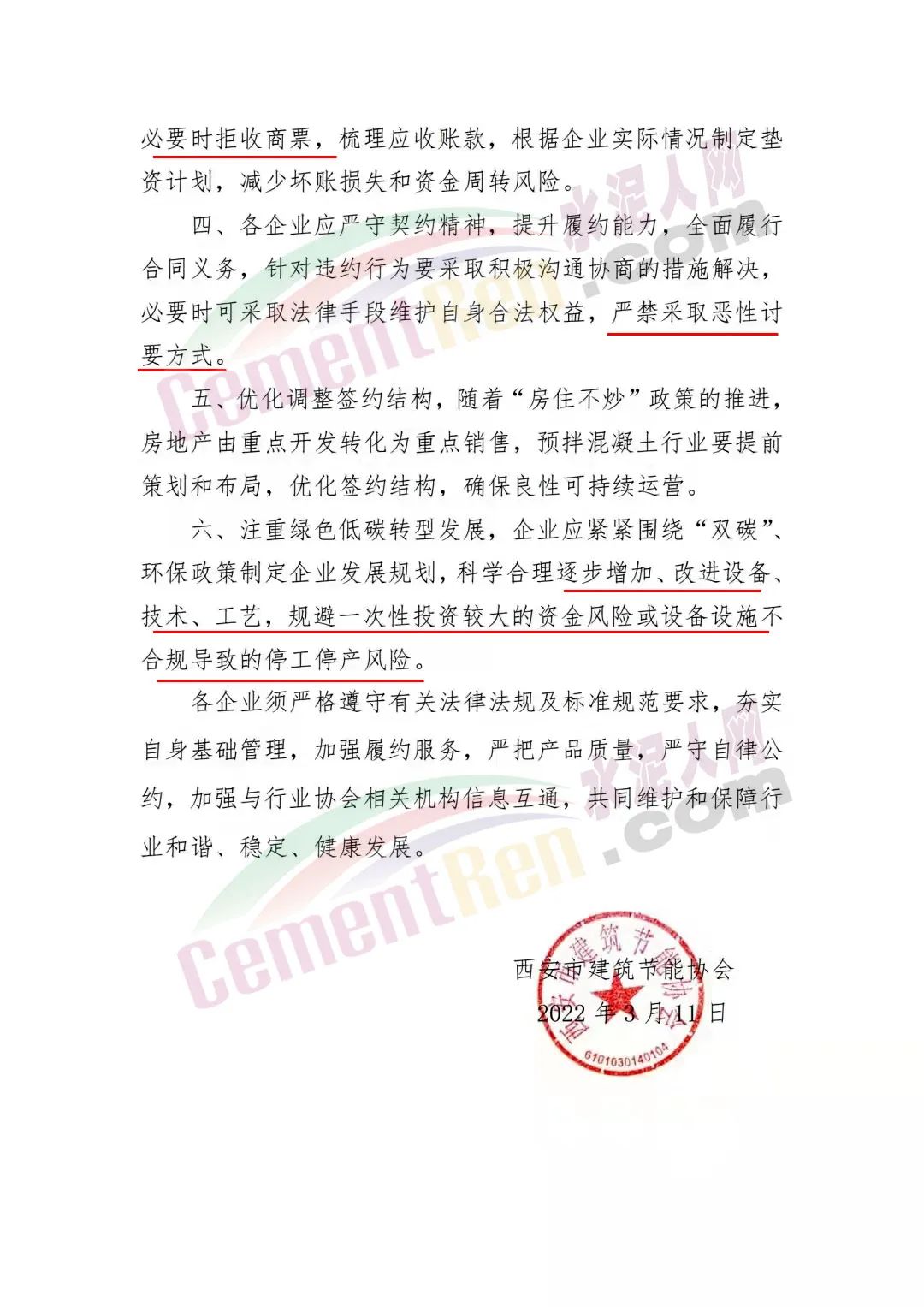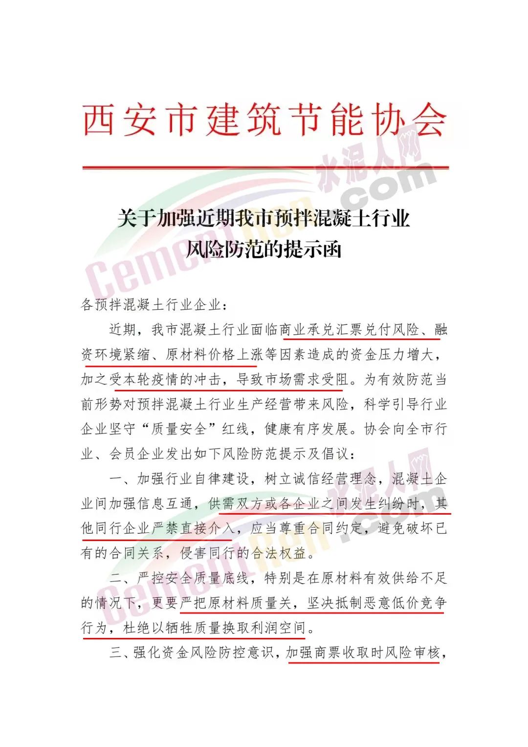 日前,西安市建筑節(jié)能協(xié)會發(fā)文稱,近期,西安市混凝土行業(yè)面臨商業(yè)承兌匯票兌付風(fēng)險(xiǎn)、融資環(huán)境緊縮、原材料價(jià)格上漲等因素造成的資金壓力增大,加之受本輪疫情的沖擊,導(dǎo)致市場需求受阻。協(xié)會特發(fā)布風(fēng)險(xiǎn)防范提示及倡議: