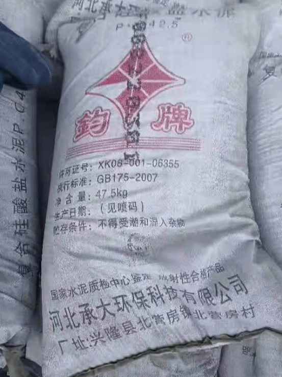 一款42.5水泥,標(biāo)稱生產(chǎn)企業(yè)為河北承大環(huán)保科技有限公司,凈含量47.5kg。生產(chǎn)許可證編號標(biāo)稱為XK08-001-06355。生產(chǎn)日期噴碼顯示“220301”字樣。