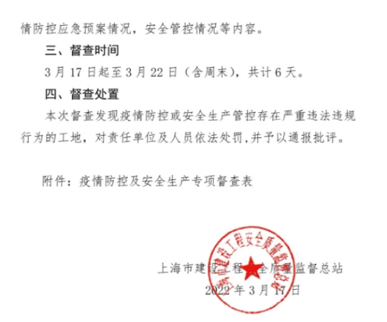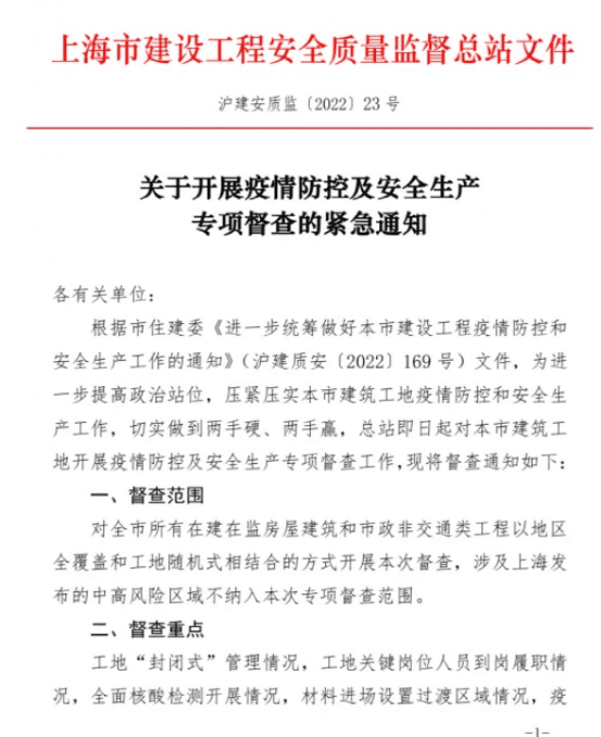 根據(jù)市住建委發(fā)布《進一步統(tǒng)籌做好本市建設(shè)工程疫情防控和安全生產(chǎn)工作的通知》(滬建質(zhì)安〔2022〕169號)文件稱,總站即日起對本市建筑工地開展疫情防控及安全生產(chǎn)專項督查工作。