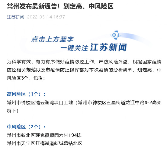 江蘇常州最新通告顯示,常州市鐘樓區(qū)清云瀾灣項目工地被列入高風(fēng)險區(qū),截至3月14日8時,該工地確診12+3人。