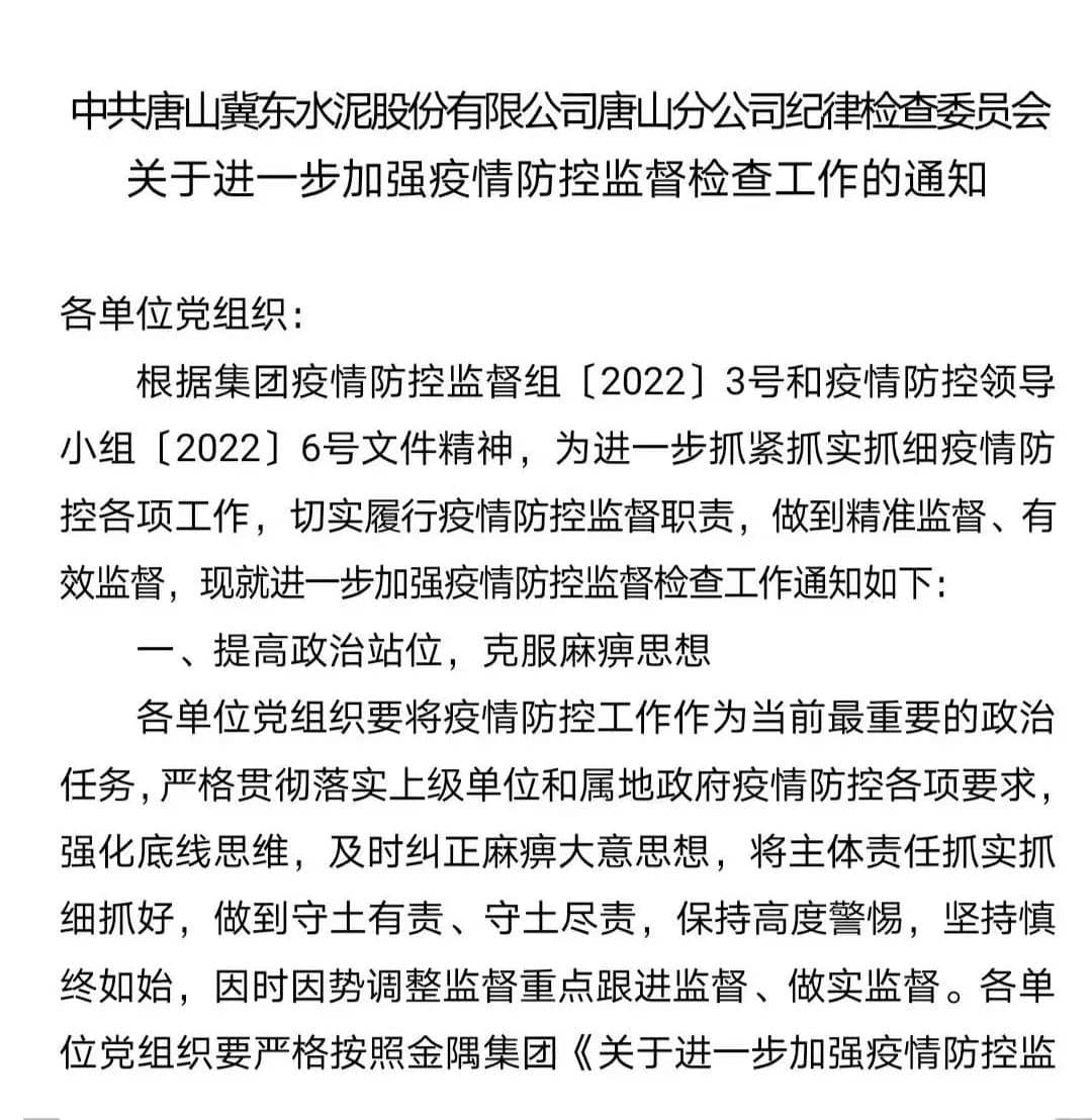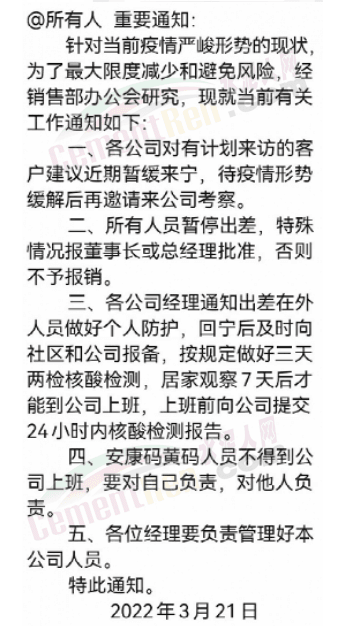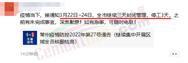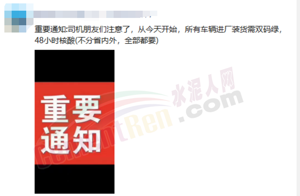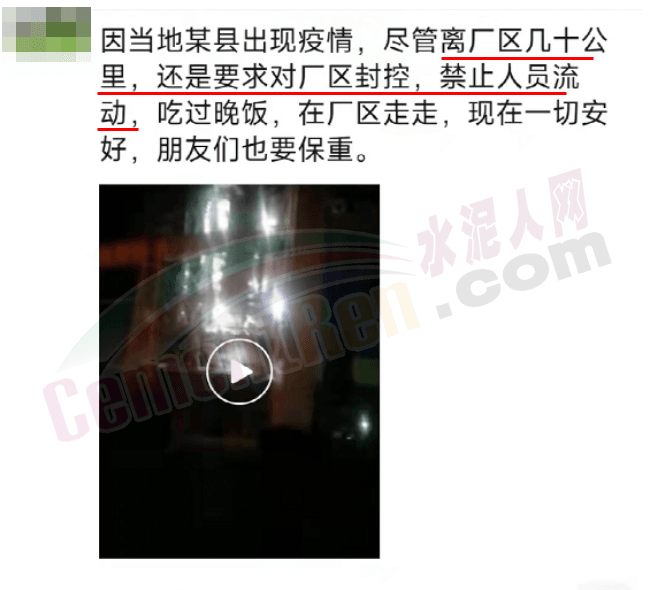 有網(wǎng)友發(fā)消息稱,因當(dāng)?shù)啬晨h出現(xiàn)疫情,距離水泥廠熟料基地幾十公里,但仍要求對廠區(qū)進行封閉管控,禁止人員流動,不許進出。