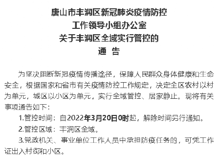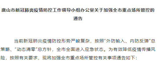 同日,唐山市新冠肺火防控工作領(lǐng)導(dǎo)小組辦公室發(fā)布加強全市重點場所管控的通告,對全市實施疫情防控臨時性交通管制。