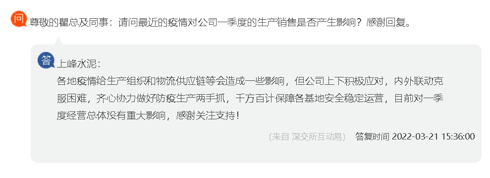 有投資者在上市平臺向上峰水泥問及疫情對公司一季度的生產(chǎn)銷售是否產(chǎn)生影響時,上峰水泥回復(fù)稱,各地疫情給生產(chǎn)組織和物流供應(yīng)鏈等會造成一些影響,但公司上下積極應(yīng)對,內(nèi)外聯(lián)動克服困難,齊心協(xié)力做好防疫生產(chǎn)兩手抓,千方百計保障各基地安全穩(wěn)定運營。