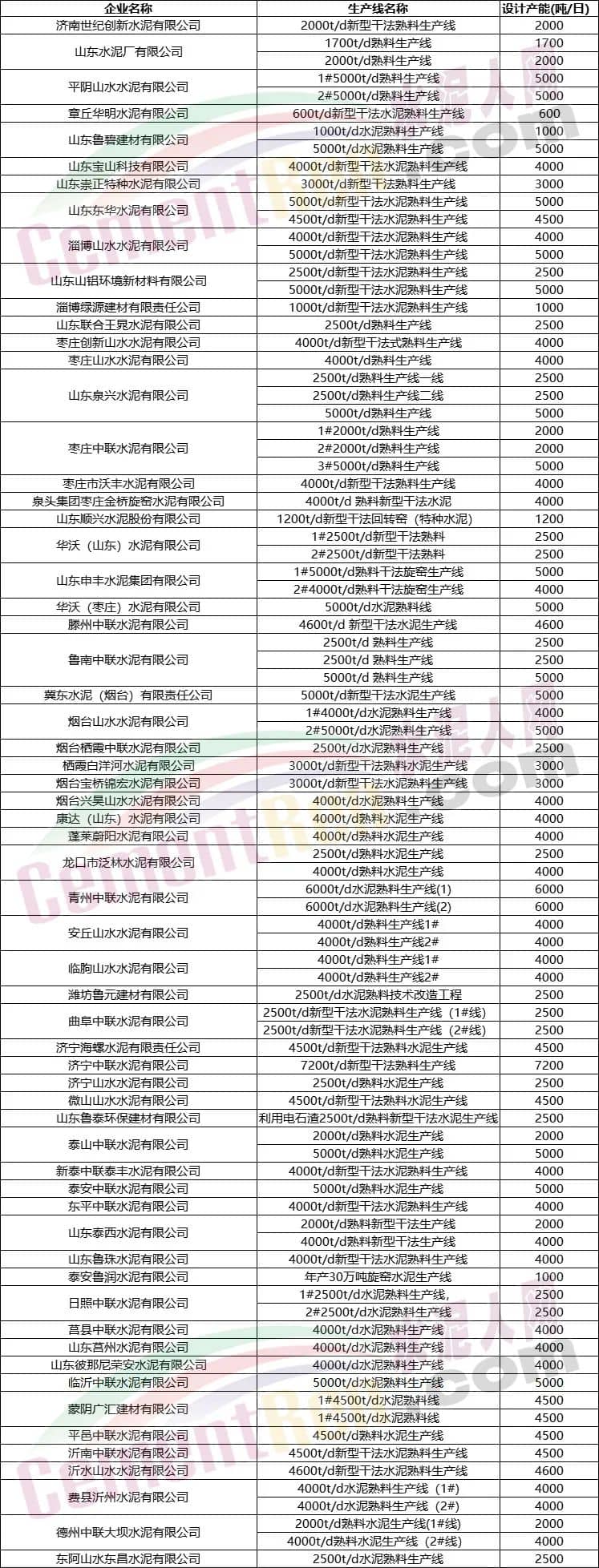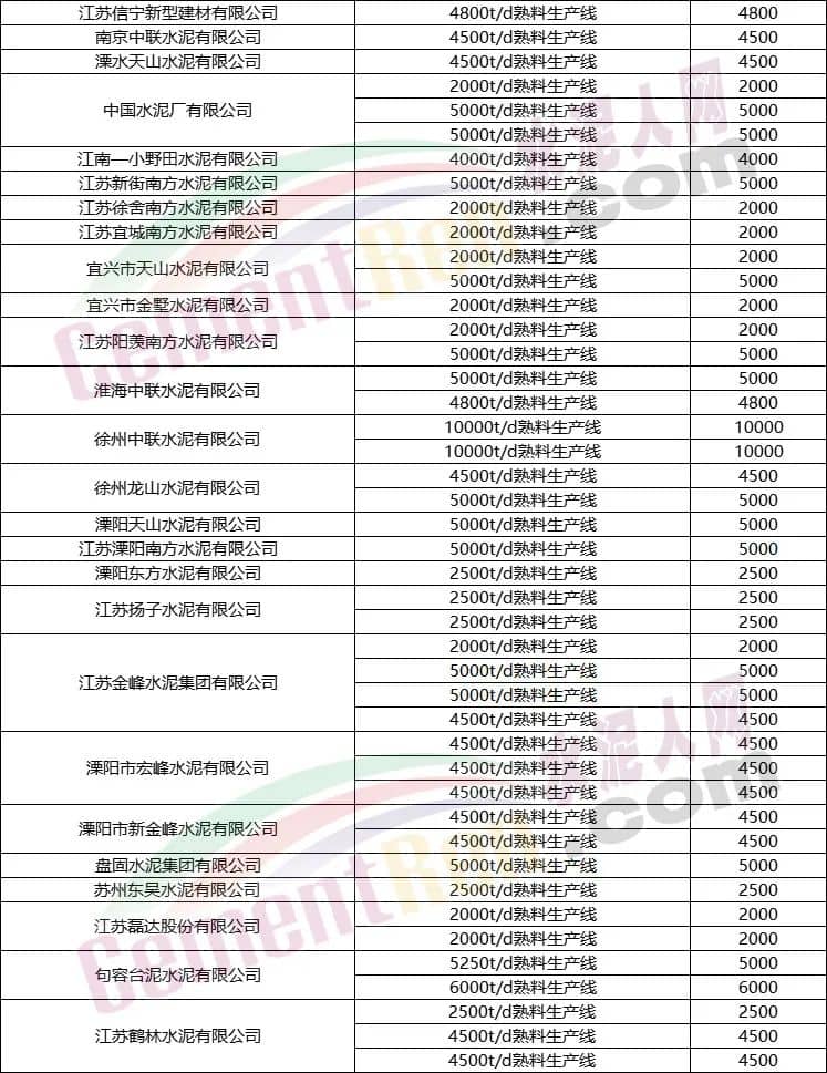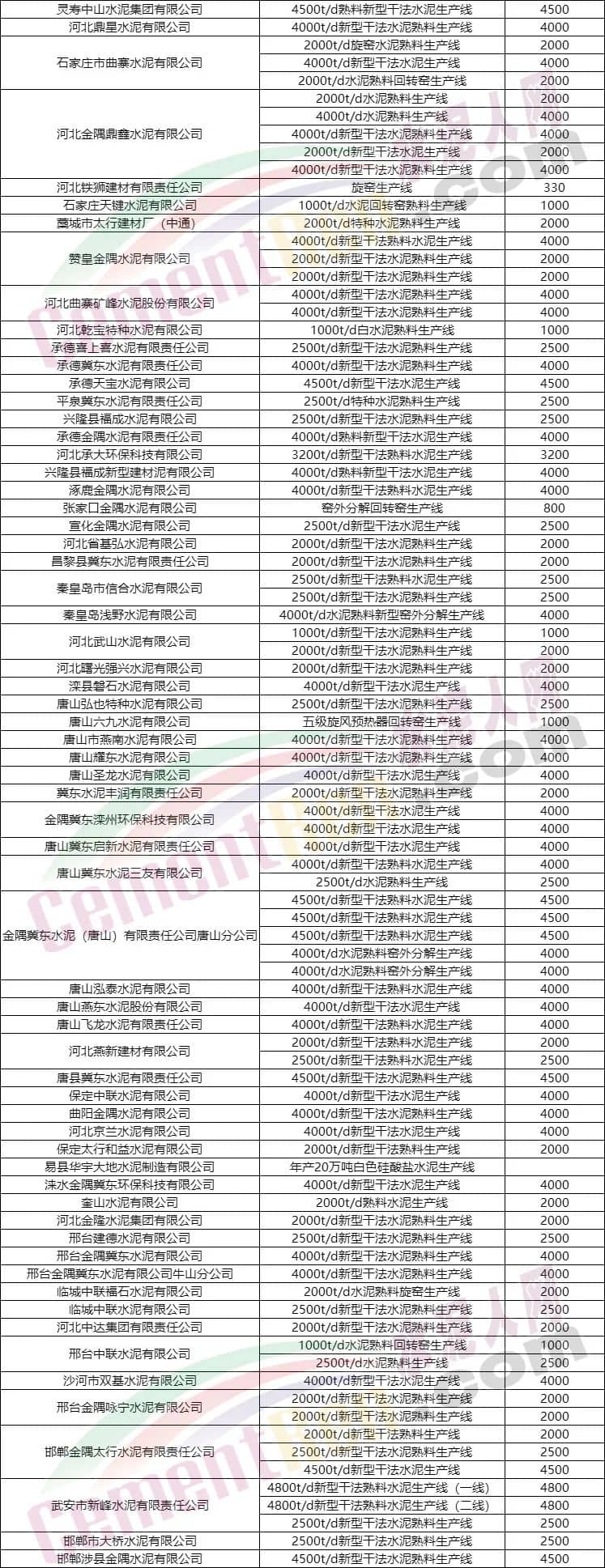 部分區(qū)域水泥熟料生產(chǎn)線清單