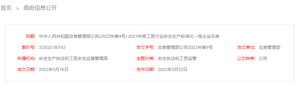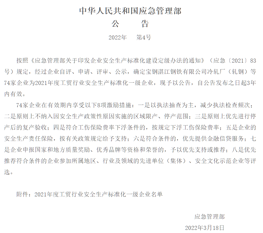 3月22日,應(yīng)急管理部發(fā)布2022年第4號公告。公告稱,按照《應(yīng)急管理部關(guān)于印發(fā)企業(yè)安全生產(chǎn)標(biāo)準(zhǔn)化建設(shè)定級辦法的通知》(應(yīng)急〔2021〕83號)規(guī)定,經(jīng)過企業(yè)自評、申請、評審、公示,確定寶鋼湛江鋼鐵有限公司冷軋廠(軋鋼)等74家企業(yè)為2021年度工貿(mào)行業(yè)安全生產(chǎn)標(biāo)準(zhǔn)化一級企業(yè),并予以公告,自公告發(fā)布之日起3年內(nèi)有效。
