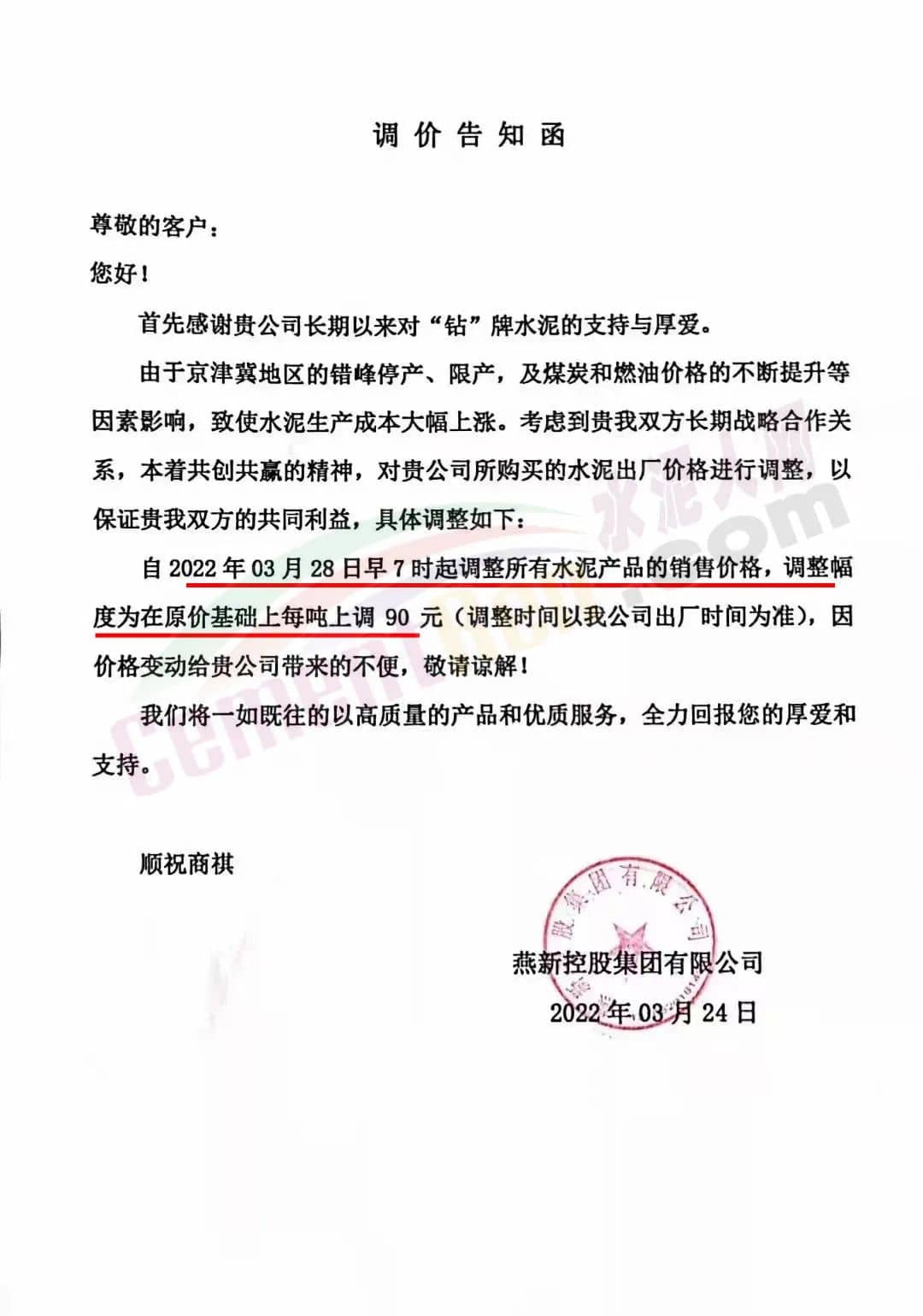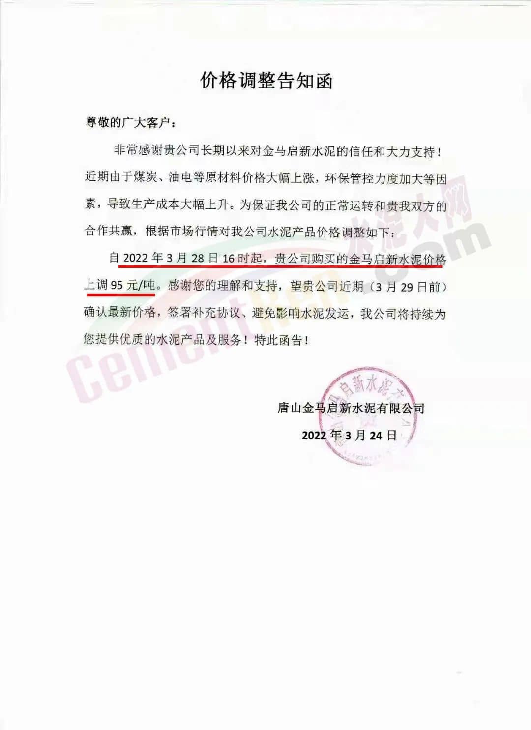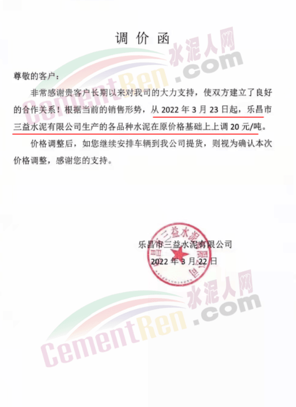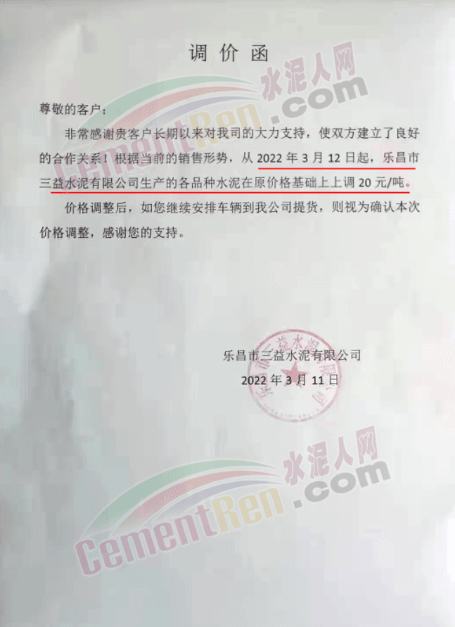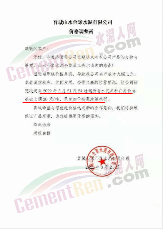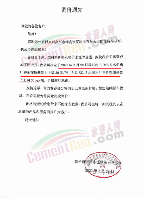 據(jù)市場反饋,不僅山西區(qū)域,近幾日多省市區(qū)域水泥價(jià)格持續(xù)上調(diào)中,3月21日,南京部分主流品牌水泥價(jià)格漲20元/噸,漲價(jià)主要針對江北部分地區(qū)。3月21日濟(jì)南水泥價(jià)格漲10-20元/噸,企業(yè)調(diào)價(jià)通知稱因油價(jià)上漲,原材料價(jià)格上漲,水泥綜合成本提升。3月19日,江西贛州地區(qū)部分廠家推漲水泥價(jià)格30-40元/噸。3月19日,湖北襄陽、十堰地區(qū)部分廠家通知上調(diào)水泥價(jià)格30-50元/噸。
