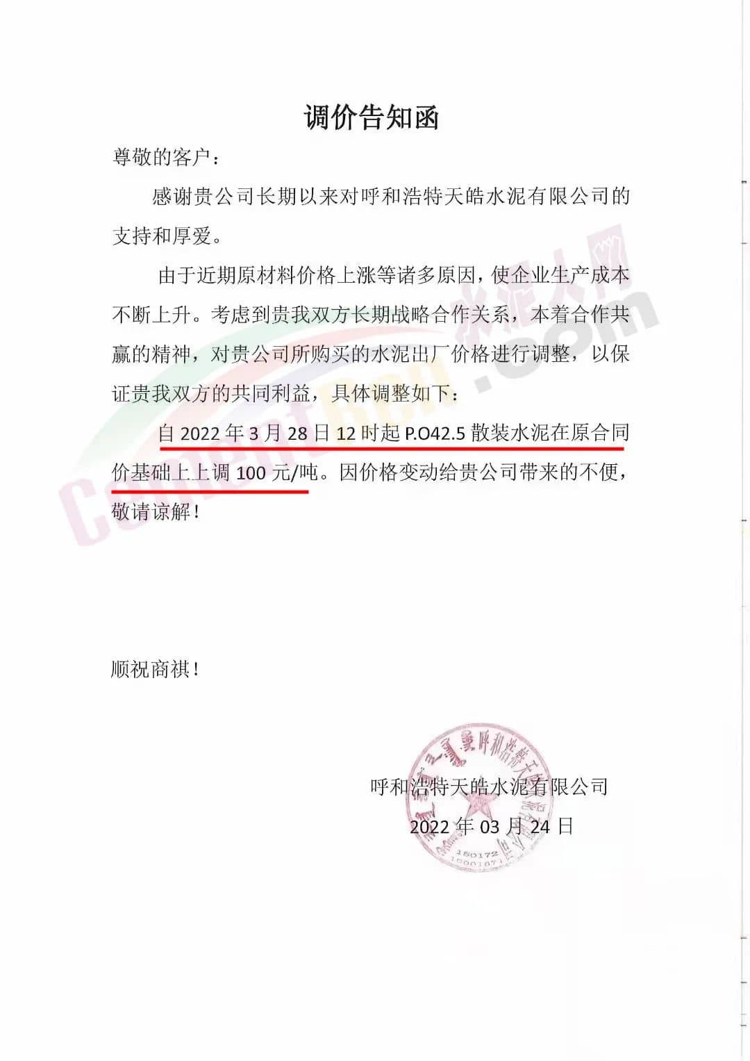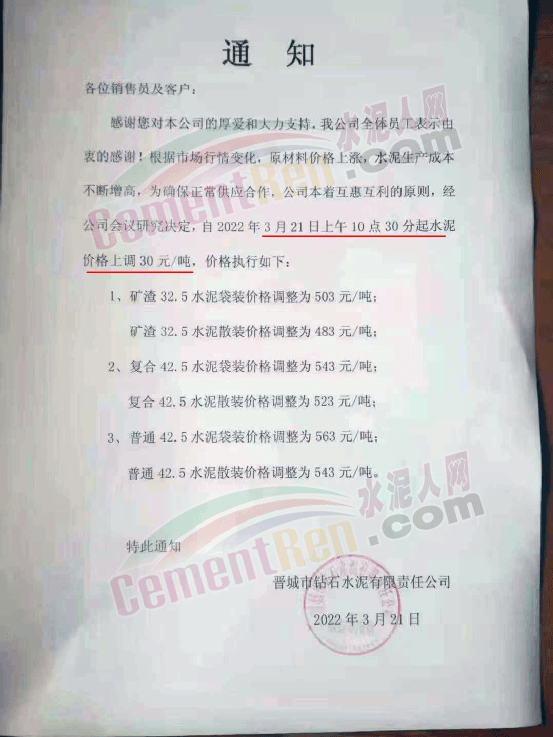 據(jù)水泥人網(wǎng)信息中心數(shù)據(jù),3月20日前后,山西多區(qū)域水泥價(jià)格通知上調(diào),山西晉城多家企業(yè)通知上調(diào)水泥價(jià)格30元/噸。晉城市鉆石水泥有限責(zé)任公司通知稱,根據(jù)市場行情變化,原材料價(jià)格上漲,水泥生產(chǎn)成本不斷增高,為確保正常供應(yīng)合作,公司本著互惠互利的原則,經(jīng)公司會(huì)議研究決定自3月21日上午10時(shí)30分上調(diào)水泥價(jià)格30元/噸,上調(diào)后礦渣32.5袋裝水泥執(zhí)行503元/噸,復(fù)合42.5袋裝水泥執(zhí)行543元/噸,普通42.5散裝水泥執(zhí)行543元/噸。