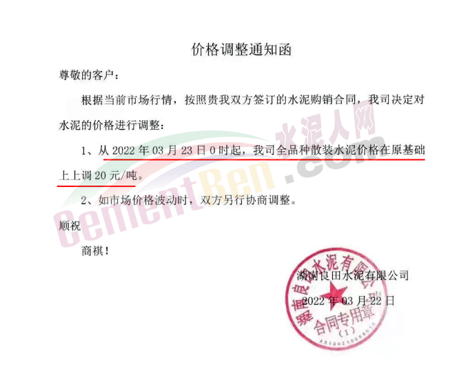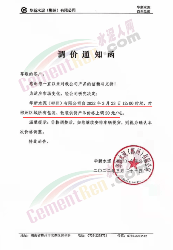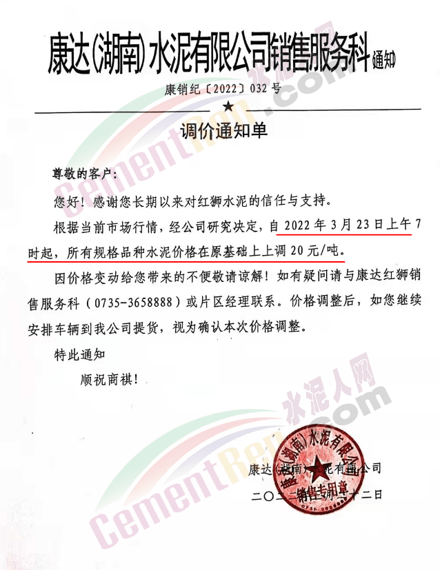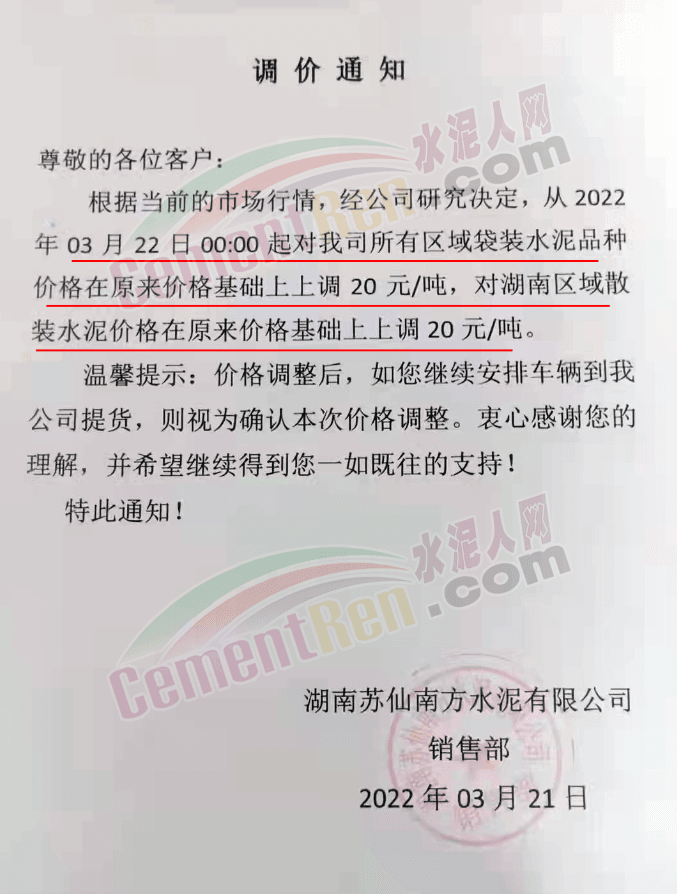 同期,湖南郴州及周邊區(qū)域多家企業(yè)通知上調(diào)水泥價(jià)格20元/噸。