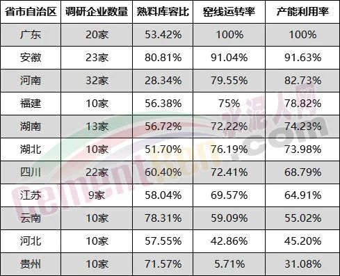 熟料庫容、窯線運(yùn)轉(zhuǎn)及產(chǎn)能利用率方面,貴州、廣東、福建、安徽、江蘇、河北、湖北、湖南、河南、云南、四川十多個(gè)區(qū)域熟料庫容比仍處于50%以上,窯線運(yùn)轉(zhuǎn)率和產(chǎn)能利用率僅廣東省達(dá)到了100%。