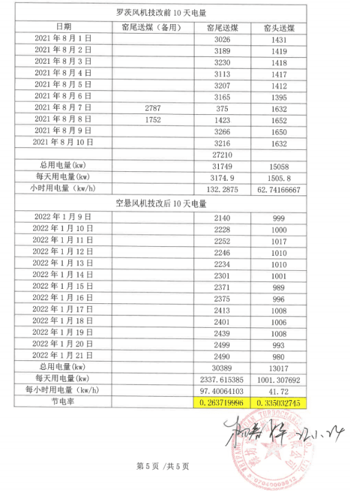 1. 依據(jù)前10天3臺羅茨風(fēng)機(jī)的平均電量(平均4968.7度/天)計(jì)算,每天可節(jié)約用電量1242度。