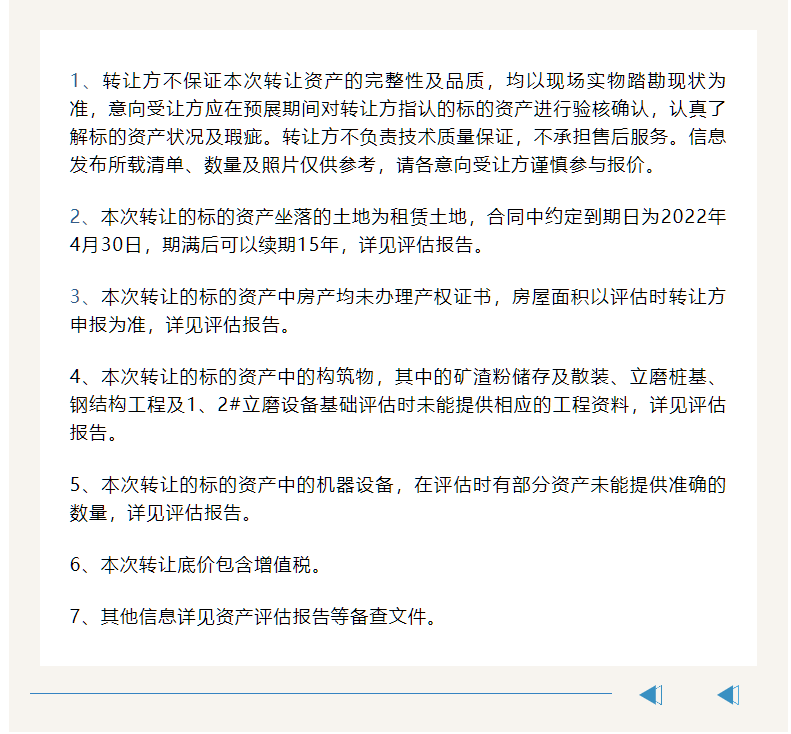 3 機(jī)器設(shè)備:共計(jì)6979臺(tái)(套),為立磨(2#、3#立磨)變壓器、低壓開(kāi)關(guān)柜、動(dòng)力電纜、空壓電纜、收塵器、沸騰爐等,大部分為2008年-2021年購(gòu)置的設(shè)備,設(shè)備技術(shù)狀況較好,均處于停用狀態(tài)。
