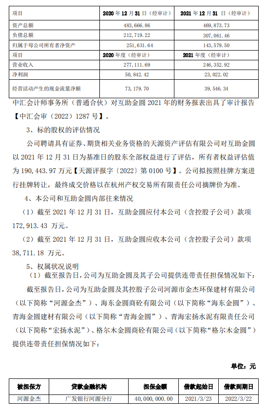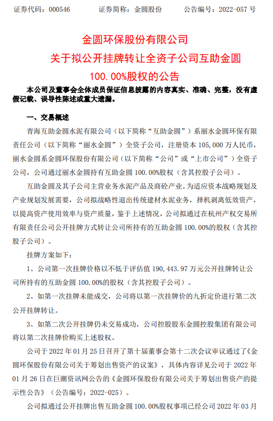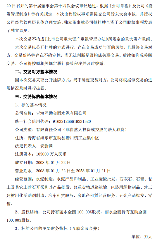 金圓股份擬掛牌轉讓互助金圓100%股權,退出水泥業(yè)務!