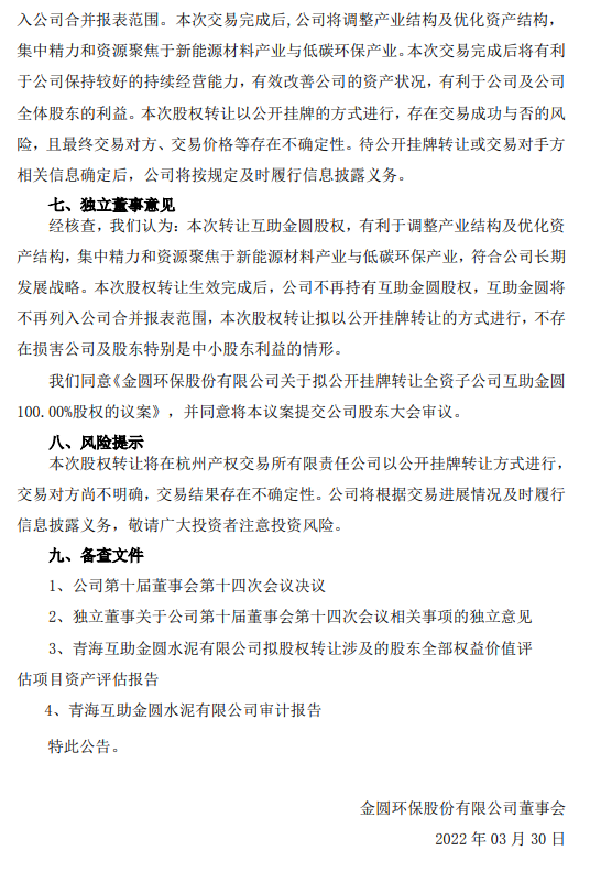 3月29日金圓股份公布,青?;ブ饒A水泥有限公司(“互助金圓”)系麗水金圓環(huán)保有限責任公司(“麗水金圓”)全資子公司,注冊資本10.5億人民幣,麗水金圓系公司全資子公司,公司通過麗水金圓持有互助金圓100%股權(含其控股子公司)。