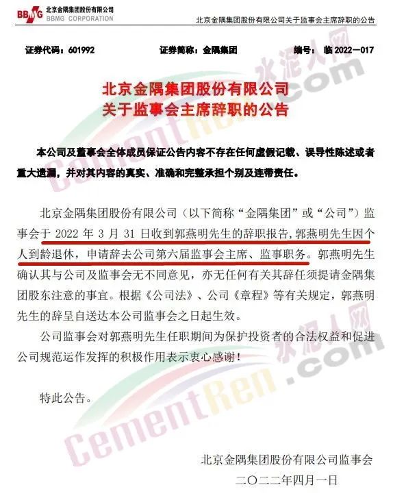 4月1日,金隅集團發(fā)布公告稱其監(jiān)事會于2022年3月31日收到郭燕明先生的辭職報告,郭燕明先生因個人到齡退休,申請辭去公司第六屆監(jiān)事會主席、監(jiān)事職務(wù)。具體公告如下:
