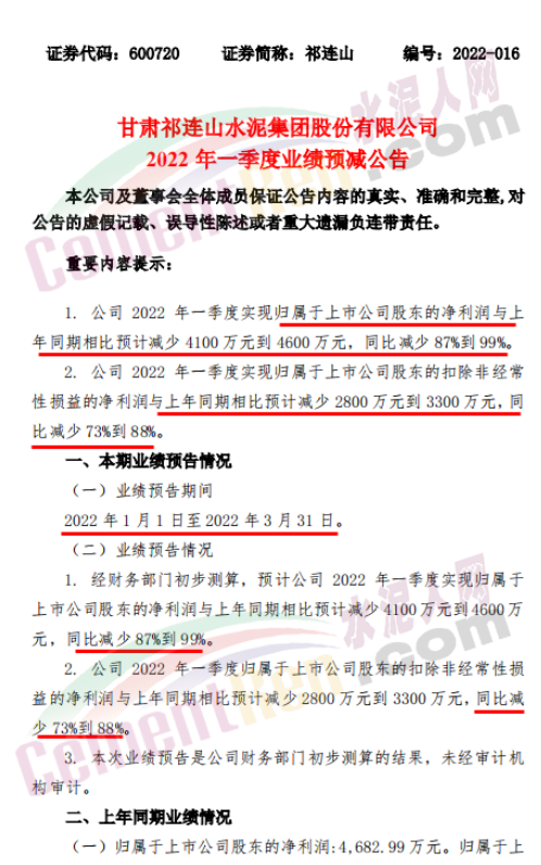 祁連山 (SH 600720,收盤價:11.04元)4月7日晚間發(fā)布業(yè)績預(yù)告,預(yù)計公司2022年一季度實現(xiàn)歸屬于上市公司股東的凈利潤與上年同期相比預(yù)計減少4100萬元到4600萬元,同比減少87%到99%。