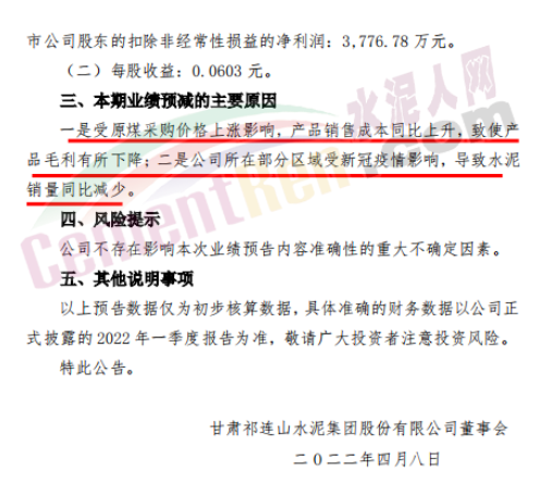 業(yè)績變動主要原因是:一是受原煤采購價格上漲影響,產(chǎn)品銷售成本同比上升,致使產(chǎn)品毛利有所下降;二是公司所在部分區(qū)域受新冠疫情影響,導(dǎo)致水泥銷量同比減少。