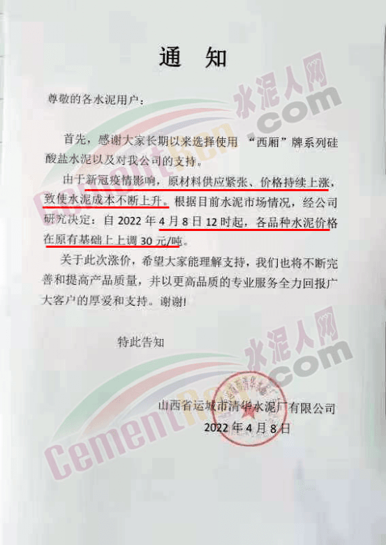 運城市清華水泥廠有限公司通知4月8月12時起,各品種水泥價格上調30元/噸。