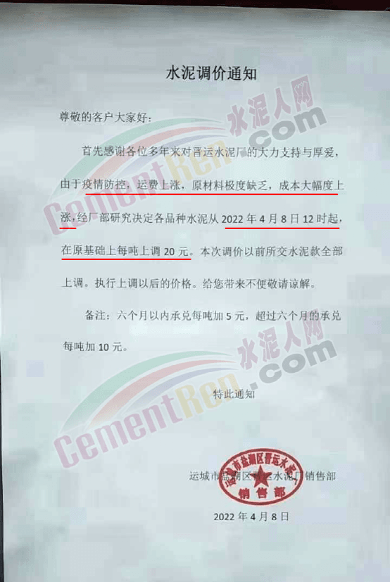 同日,山西運城多家水泥企業(yè)通知因新冠疫情影響,原材料供應緊張,價格持續(xù)上漲,致使水泥成本不斷上升,根據(jù)目前情況經(jīng)公司研究決定上調水泥價格。