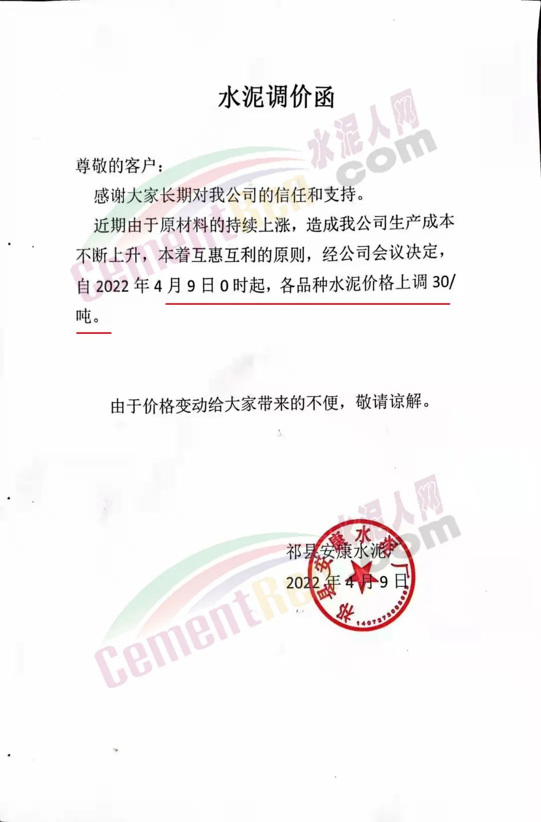 祁縣安康水泥調價函稱,由于原材料的持續(xù)上漲,造成公司生產成本不斷上升,經(jīng)公司會議決定自4月9日0時起,各品種水泥價格上調30元/噸。