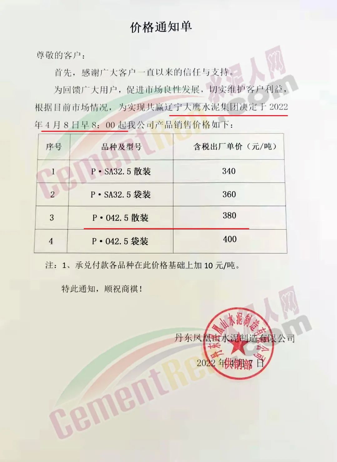 丹東鳳凰山水泥制造有限公司通知稱,根據(jù)目前市場情況,為實現(xiàn)共贏,遼寧大鷹水泥集團決定于4月8日早8時起公司產品銷售價格做調整 ,其中P.O42.5散裝水泥執(zhí)行380元/噸。承兌付款各品種在此價格基礎上加10元/噸。