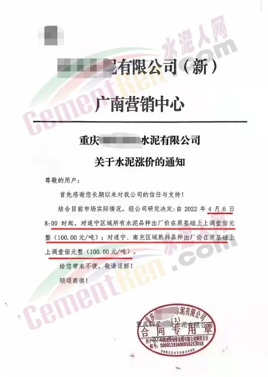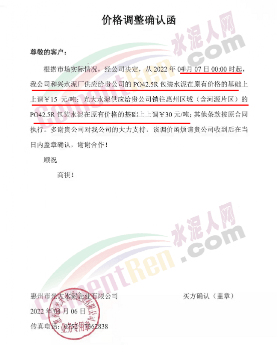 廣東惠州市光大水泥企業(yè)有限公司通知從2022年4月7日0時起,公司和興水泥廠供應給貴公司的P.O42.5R包裝水泥在原有價格的基礎上上調15元/噸;光大水泥供應給貴公司銷往惠州區(qū)域(含河源片區(qū))的P.O42.5R包裝水泥在原有價格的基礎上上調30元/噸;其他條款按原合同執(zhí)行。