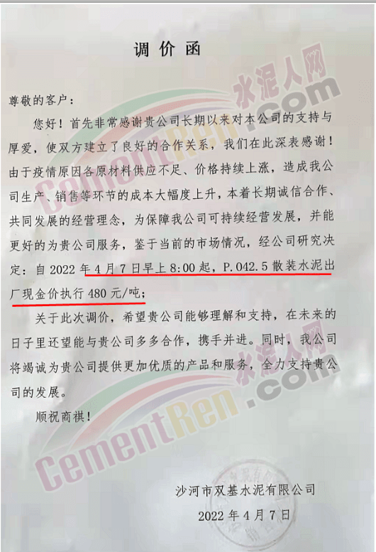 沙河市雙基水泥有限公司通知,由于疫情原因各原材料供應不足、價格持續(xù)上漲,造成公司生產、銷售等環(huán)節(jié)的成本大幅度上升,本著長期誠信合作、共同發(fā)展的經(jīng)營理念,為保障公司可持續(xù)經(jīng)營發(fā)展,并能更好的為貴公司服務,鑒于當前的市場情況,經(jīng)公司研究決定,自2022年4月7日早上8時起,P.O42.5散裝水泥出廠現(xiàn)金價執(zhí)行480元/噸。