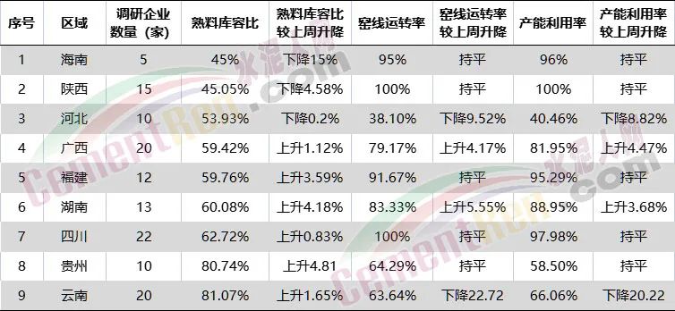 截止周五(4月8日),海南、陜西、河北、廣西、福建、湖南、四川、貴州、云南9個省市自治區(qū)熟料庫容比同比上周“六升三降”,窯線運轉率和產能利用率較上周同比“二升二降五平”。其中云南、貴州熟料庫容比均在80%以上,窯線運轉率、產能利用率同比出現(xiàn)20%以上的下降。