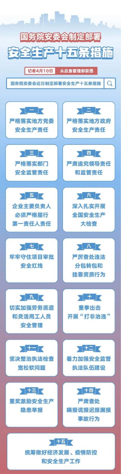 國(guó)務(wù)院安委辦有關(guān)負(fù)責(zé)人介紹,國(guó)務(wù)院安委會(huì)梳理相關(guān)法律法規(guī)已有規(guī)定、以往管用舉措和近年來(lái)針對(duì)新情況采取的有效措施,制定了進(jìn)一步強(qiáng)化安全生產(chǎn)責(zé)任落實(shí)、堅(jiān)決防范遏制重特大事故的十五條措施,部署發(fā)動(dòng)各方面力量全力抓好安全防范工作。