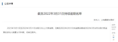 日前,上海票交所發(fā)布《截至2022年3月31日持續(xù)逾期名單》通知公告稱,2021年10月1日至2022年3月31日出現(xiàn)3次以上付款逾期,且截至2022年3月31日有逾期余額或2022年3月當(dāng)月出現(xiàn)付款逾期的承兌人數(shù)量為1904家。