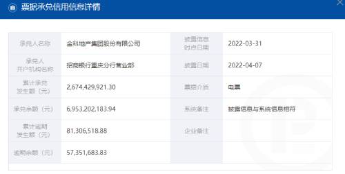 金科地產(chǎn)集團的票據(jù)承兌信用信息詳情顯示, 累計逾期發(fā)生額約8130.66萬元,逾期余額約5735.17萬元。