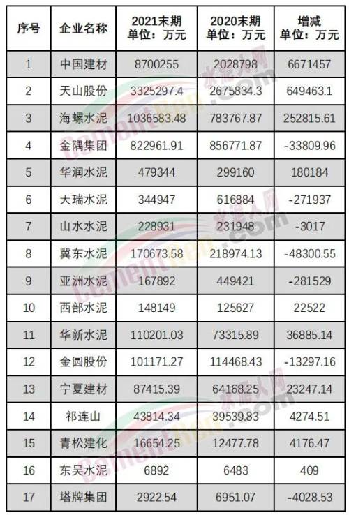 據(jù)水泥人網(wǎng)不完全統(tǒng)計,水泥行業(yè)17家上市公司,2021年末期應(yīng)收票據(jù)和賬款“10增7減”。其中中國建材、天山股份、海螺水泥、華潤水泥、華新水泥、寧夏建材、西部水泥、祁連山、青松建化、東吳水泥等10家企業(yè)較上年同期均有增長。山水水泥、塔牌集團、金圓股份、金隅集團、冀東水泥、天瑞水泥、亞洲水泥7家企業(yè)有所減少。
