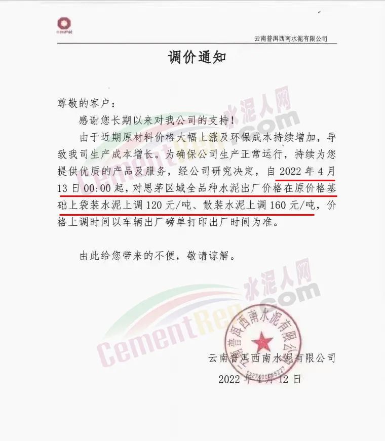 日前,云南普洱西南水泥有限公司調(diào)價(jià)通知稱,由于近期原材料價(jià)格大幅上漲及環(huán)保成本持續(xù)增加,導(dǎo)致公司生產(chǎn)成本增長(zhǎng)。為確保公司生產(chǎn)正常運(yùn)行,持續(xù)為客戶提供優(yōu)質(zhì)的產(chǎn)品及服務(wù),經(jīng)公司研究決定,自4月13日時(shí)起,對(duì)思茅區(qū)域全品種水泥袋裝上調(diào)120元/噸,散裝水泥上調(diào)160元/噸,價(jià)格上調(diào)時(shí)間以車輛出廠磅單打印出廠時(shí)間為準(zhǔn)。