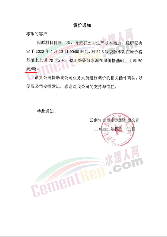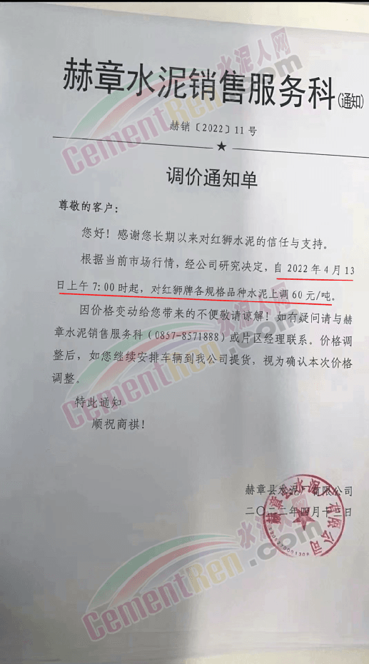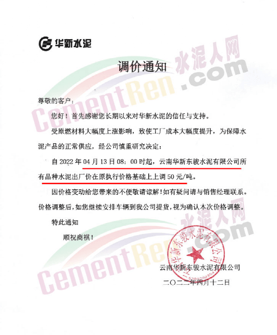 華新水泥(劍川)有限公司通知因市場(chǎng)情況變化,經(jīng)公司研究決定自4月10日8時(shí)起,32.5級(jí)和42.5級(jí)所有品種水泥上調(diào)50元/噸。