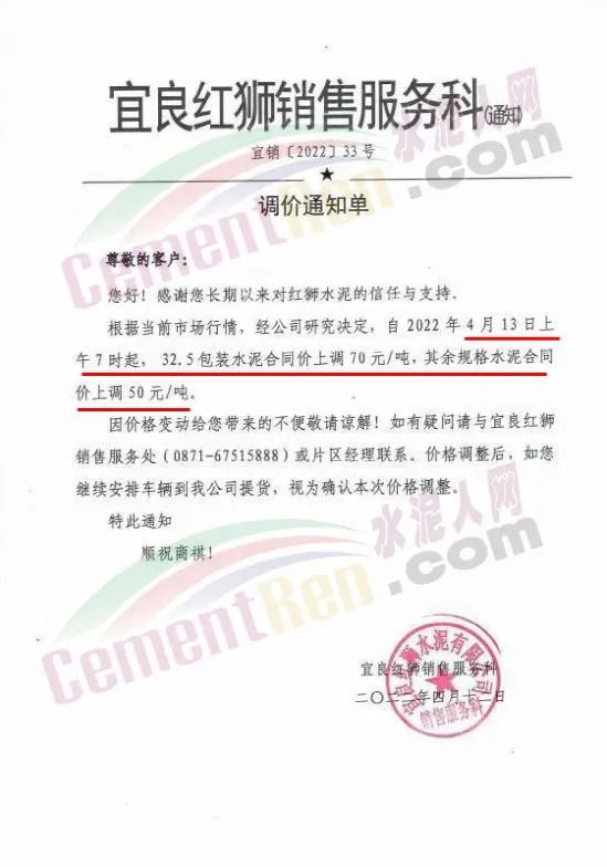 宜良紅獅銷售服務(wù)科通知,根據(jù)當(dāng)前市場(chǎng)行情經(jīng)公司研究決定,自4月13日上午7時(shí)起,32.5包裝水泥上調(diào)70元/噸,其余規(guī)格水泥合同價(jià)上調(diào)50元/噸。