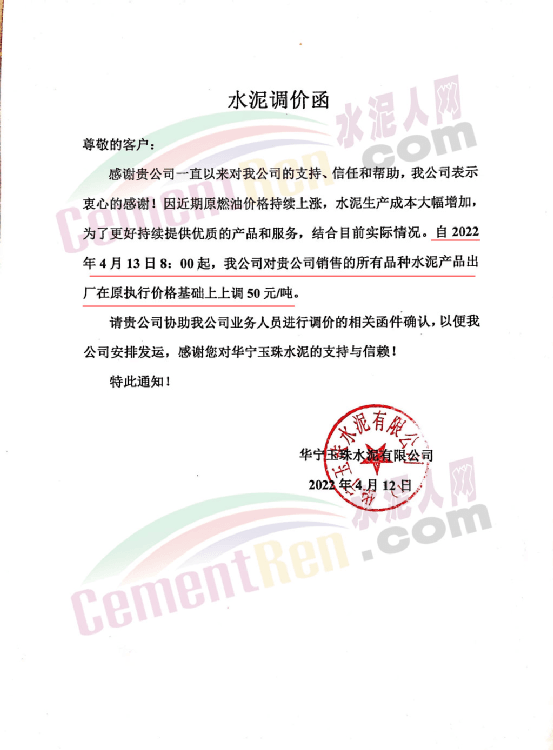 華寧玉珠水泥有限公司通知,自4月13日8時(shí)起,所有品種水泥出廠價(jià)上調(diào)50元/噸。