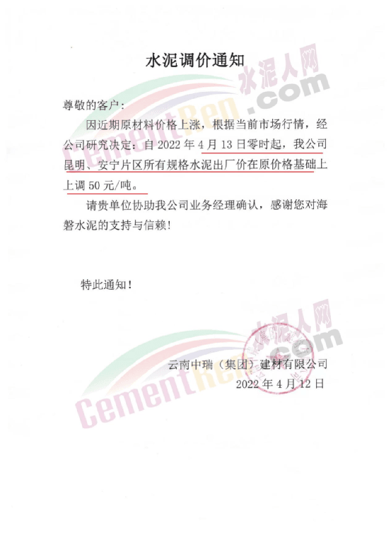 云南中瑞(集團(tuán))建材有限公司通知,4月13日0時(shí)起,昆明、安寧片區(qū)所有規(guī)格水泥出廠價(jià)上調(diào)50元/噸。