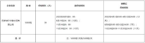 調(diào)整后停窯時間:2022年4月1日0:00-4月12日24:00(12天);8月6日0:00-8月12日24:00(7天);11月20日0:00-11月30日24:00(11天)??偼8G時間保持30天不變。