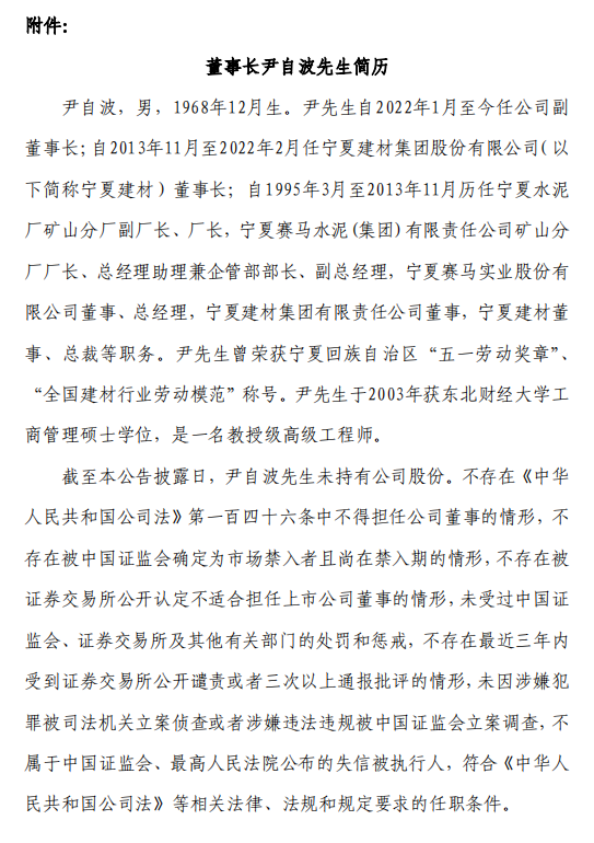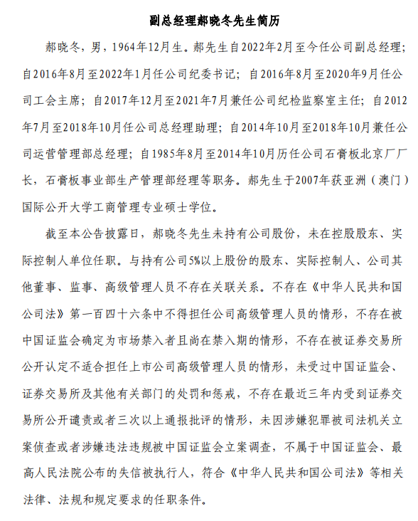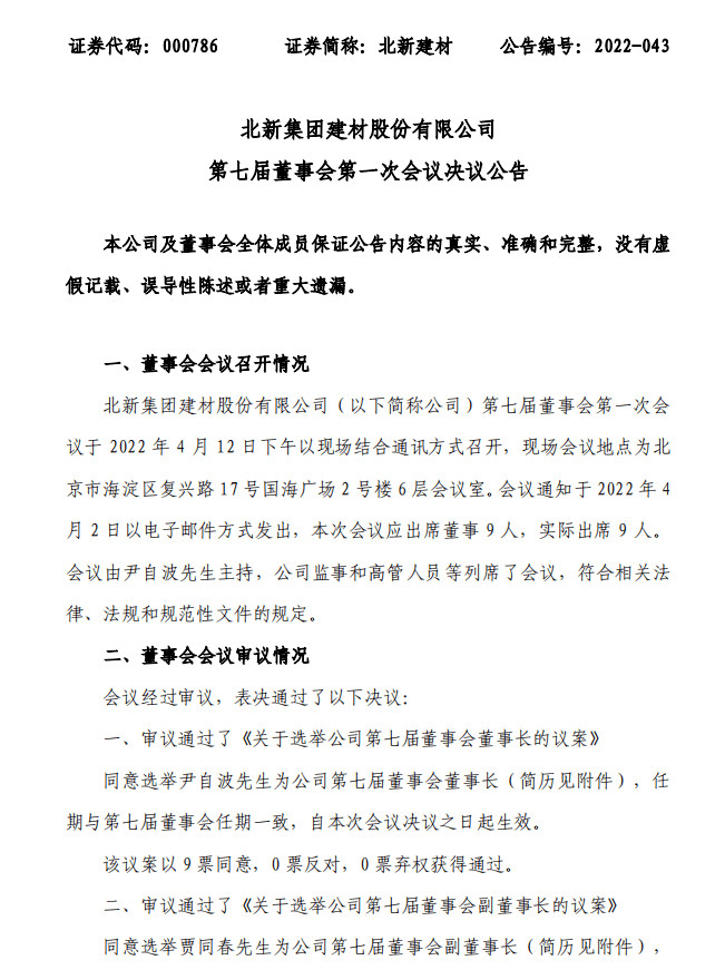 4月12日,北新建材發(fā)布第七屆董事會(huì)第一次會(huì)議決議公告稱(chēng),此次會(huì)議審議通過(guò)了《關(guān)于選舉公司第七屆董事會(huì)董事長(zhǎng)的議案》,同意選舉尹自波先生為公司第七屆董事會(huì)董事長(zhǎng),任期與第七屆董事會(huì)任期一致,自本次會(huì)議決議之日起生效。