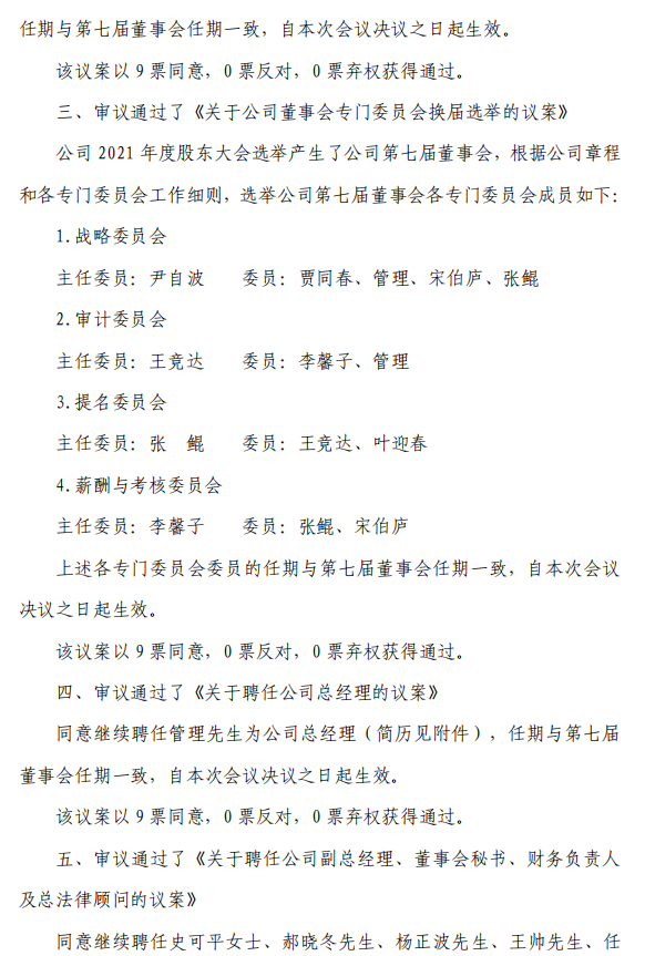 繼續(xù)聘任管理先生為公司總經(jīng)理,任期與第七屆董事會(huì)任期一致,自本次會(huì)議決議之日起生效。