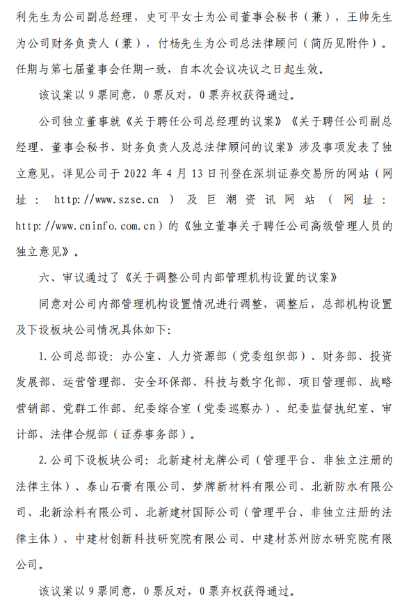 公司下設(shè)板塊公司:北新建材龍牌公司(管理平臺(tái)、非獨(dú)立注冊(cè)的法律主體)、泰山石膏有限公司、夢(mèng)牌新材料有限公司、北新防水有限公司、北新涂料有限公司、北新建材國(guó)際公司(管理平臺(tái)、非獨(dú)立注冊(cè)的法律主體)、中建材創(chuàng)新科技研究院有限公司、中建材蘇州防水研究院有限公司。