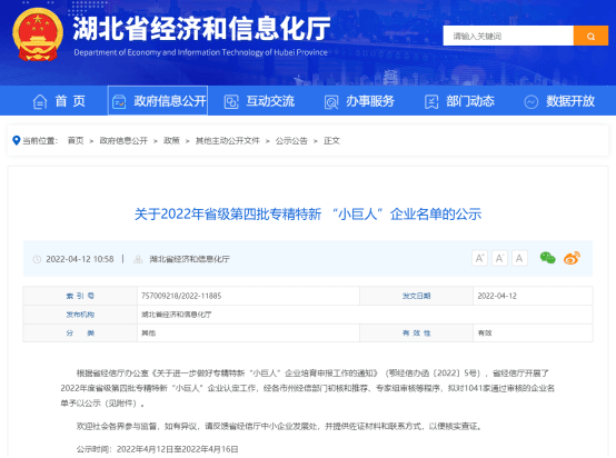 2022年省級第四批專精特新“小巨人”