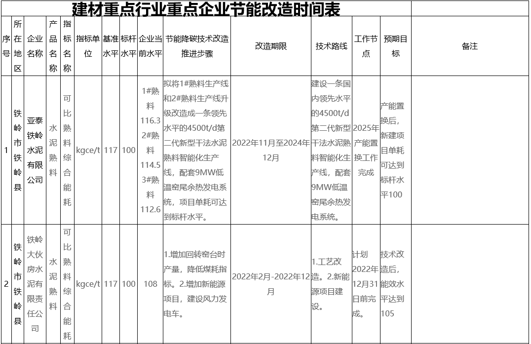 附表:水泥行業(yè)重點企業(yè)節(jié)能改造時間表