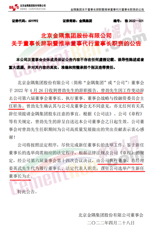 4月27日晚間金隅集團(tuán)發(fā)布公告稱,北京金隅集團(tuán)股份有限公司董事會(huì)于 2022 年 4 月 26 日收到曾勁先生的辭職報(bào)告。曾勁先生因工作變動(dòng)辭去公司第六屆董事會(huì)董事長、執(zhí)行董事、董事會(huì)戰(zhàn)略與投融資委員會(huì)主任職務(wù)。