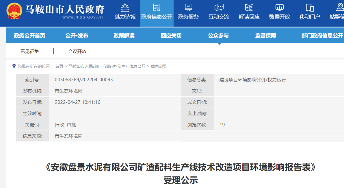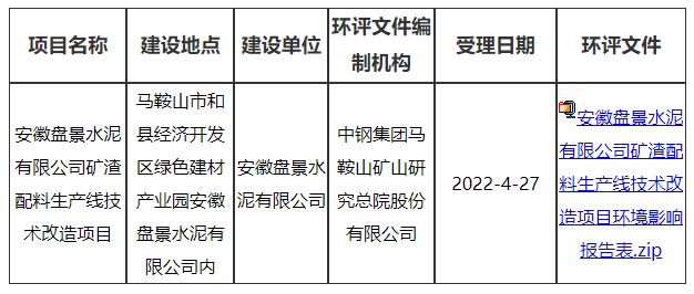 2022年4月27日,我局受理了《安徽盤景水泥有限公司礦渣配料生產線技術改造項目環(huán)境影響報告表》