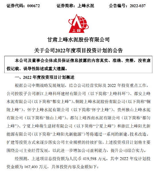 4月26日晚間,甘肅上峰水泥股份有限公司發(fā)布《關(guān)于公司2022年度項(xiàng)目投資計(jì)劃的公告》稱,根據(jù)公司中期戰(zhàn)略發(fā)展規(guī)劃,結(jié)合公司經(jīng)營(yíng)實(shí)際及 2022 年投資重點(diǎn)工作,公司控股子公司浙江上峰科環(huán)建材有限公司、都安上峰水泥有限公司、銅陵上峰水泥股份有限公司、懷寧上峰水泥有限公司、貴州獨(dú)山上峰水泥有限公司、都勻上峰西南水泥有限公司、寧夏上峰萌生建材有限公司和浙江上峰陽(yáng)光新能源有限公司等將通過(guò)一系列的新建、技術(shù)改造、 擴(kuò)建等投資方式來(lái)逐步落實(shí)公司主業(yè)規(guī)模的持續(xù)擴(kuò)張,上述投資項(xiàng)目計(jì)劃將主要圍繞公司主業(yè)經(jīng)營(yíng)發(fā)展,以此進(jìn)一步增加公司盈利能力,提升公司綜合實(shí)力。經(jīng)預(yù)測(cè),上述項(xiàng)目總投資額為人民幣419,598萬(wàn)元,其中2022年度計(jì)劃投資金額為167,400 萬(wàn)元。