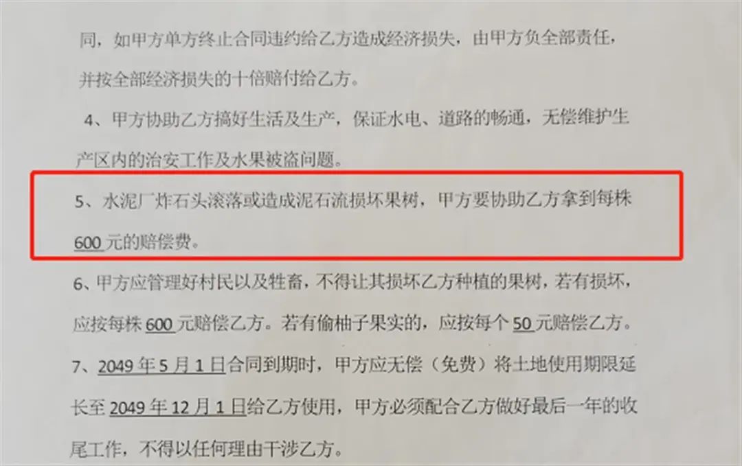 楊先生與曼空村簽訂的土地租賃合同書顯示,楊先生租用的170余畝土地位于華新紅塔水泥廠采石山腳下,其中提到:“水泥廠炸石頭滾落或造成泥石流損壞果樹,出租方需要協(xié)助楊先生拿到每株600元的賠償費(fèi)。”