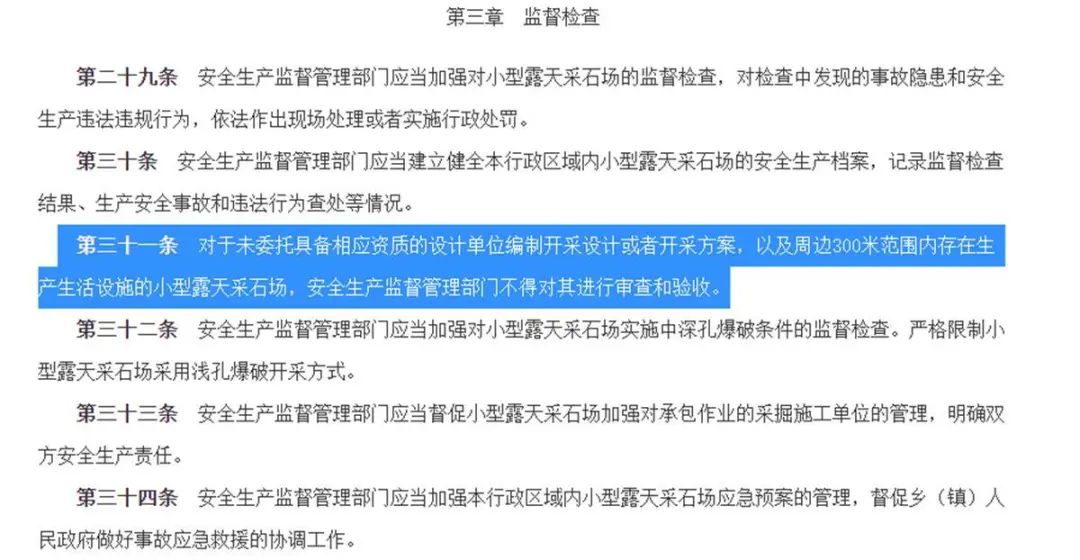 “水泥廠實(shí)施爆破采石,卻不夠安全距離,不符合法律規(guī)定。”楊先生提出,按照小型露天采石場安全管理與監(jiān)督檢查規(guī)定(安全監(jiān)管總局令第39號)第三十一條的要求:對于未委托具備相應(yīng)資質(zhì)的設(shè)計(jì)單位編制開采設(shè)計(jì)或者開采方案,以及周邊300米范圍內(nèi)存在生產(chǎn)生活設(shè)施的小型露天采石場,安全生產(chǎn)監(jiān)督管理部門不得對其進(jìn)行審查和驗(yàn)收。